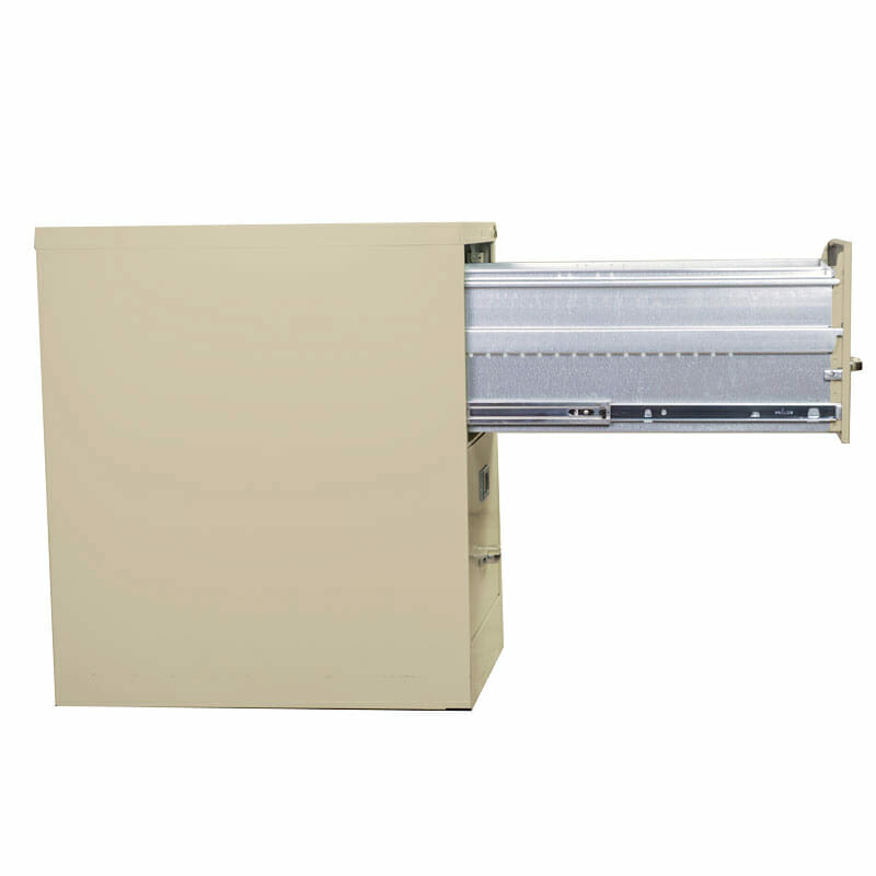 El archivero institucional vertical de 2 gavetas tamaño oficio es una solución práctica y resistente para el almacenamiento seguro de documentos en oficinas, hogares o pequeñas empresas, especialmente diseñado para un uso continuo y de alto volumen. Su estructura está fabricada con lámina calibre 22 en el cuerpo principal, incluyendo cubierta superior, zócalo y refuerzos, mientras que los costados y respaldo están elaborados en lámina rolada en frío calibre 24, todo ensamblado sin soldadura para mayor durabilidad y estabilidad. Cuenta con dos cajones con porta etiquetas, fondo de lámina galvanizada con sistema de costilla troquelada y costados altos ideales para folders colgantes. Cada gaveta incorpora un botón de seguridad que evita aperturas accidentales, además de correderas telescópicas de suspensión embalinada que permiten un deslizamiento suave y de máxima extensión. Incluye cerradura de cilindro removible con dos llaves y un sistema de bloqueo mecánico que impide la apertura simultánea de cajones, brindando mayor seguridad. Su acabado con pintura resistente y su capacidad de carga de hasta 45 kg lo convierten en una opción confiable, funcional y duradera para la organización eficiente de archivos.