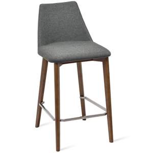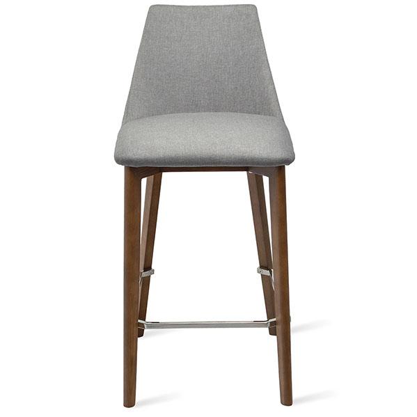 Banco tapizado en tela con base de madera color nogal y pose pie en acero inoxidable.