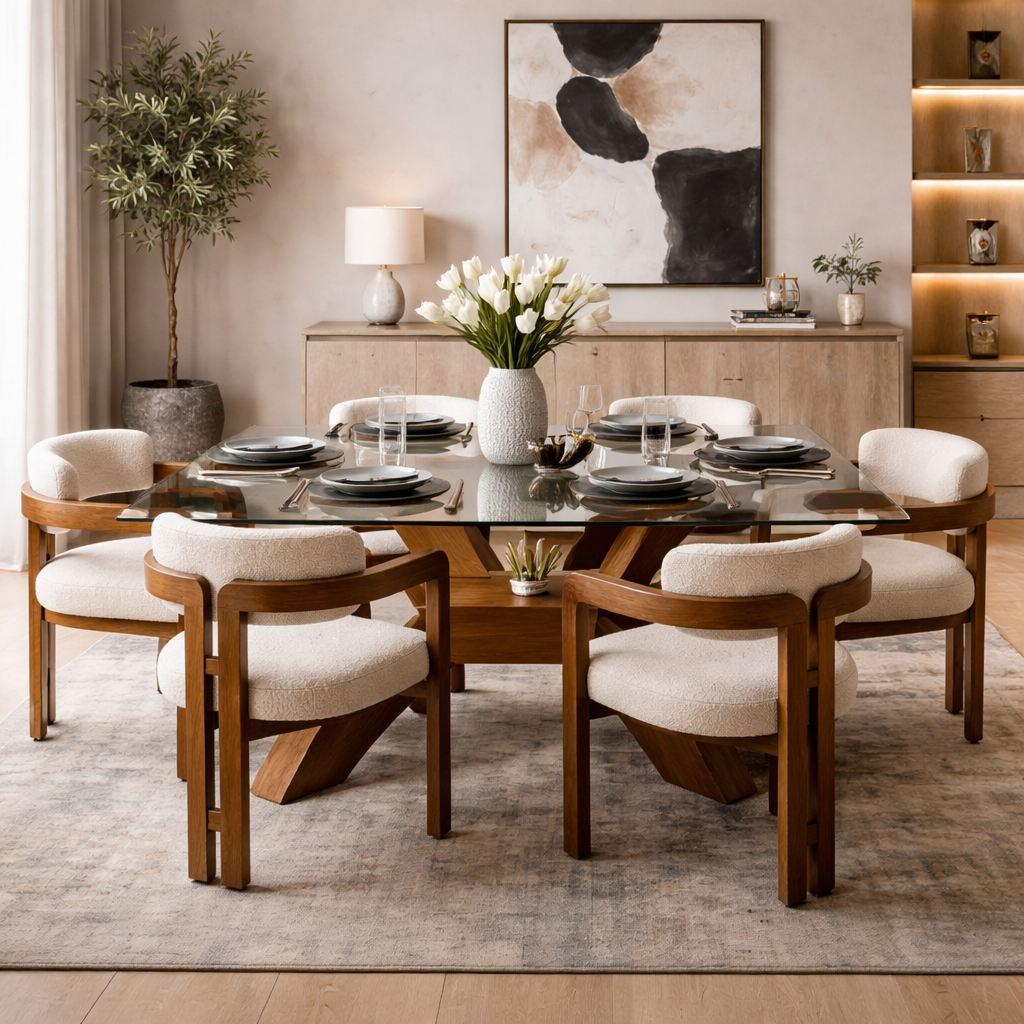 Elegante comedor contemporáneo que combina diseño y funcionalidad. La mesa cuenta con una cubierta de cristal templado que aporta amplitud visual y sofisticación al espacio, sostenida por una base de madera con diseño moderno que brinda estabilidad y estilo.
