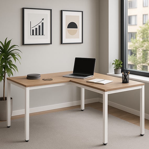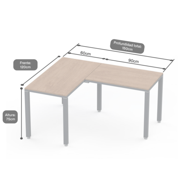Escritorio moderno y funcional con cubierta de melamina en varios tonos y estructura blanca u oxford. Fabricado en madera prensada de 16 mm con encintado PVC de 2 mm, ideal para optimizar tu espacio de trabajo en oficina u hogar.