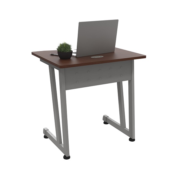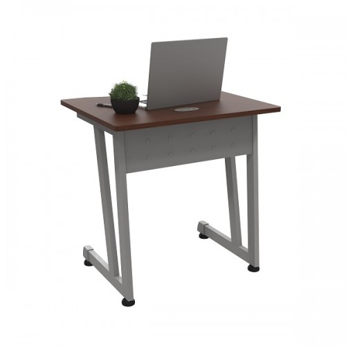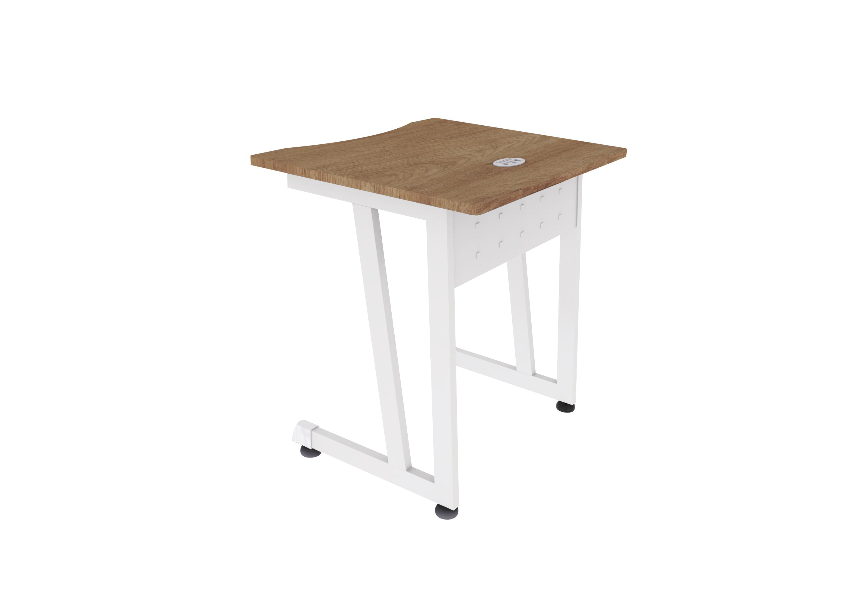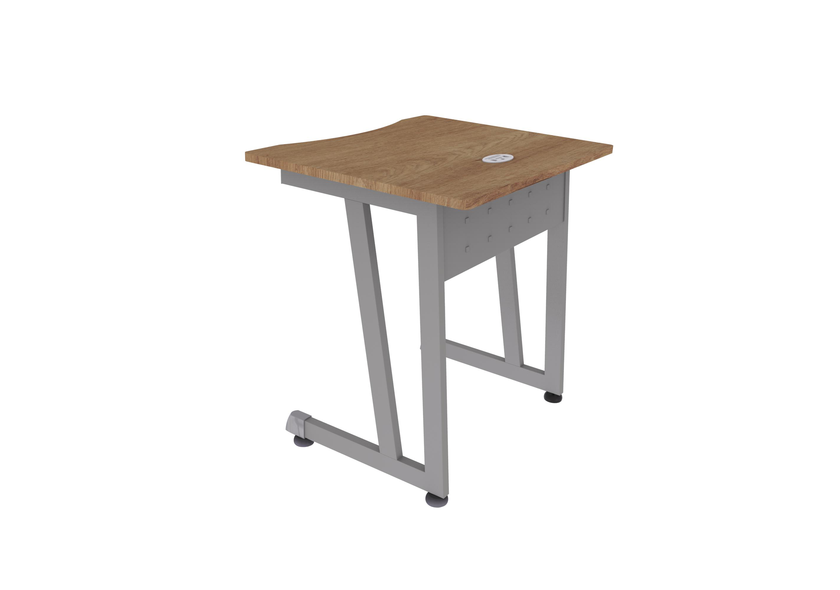 75 cm x 60 cm en melamina de 19 mm termo fusionada en ambas caras con cubre cantos de PVC 1 mm, con grommet para paso de cables. Costados conformados por 2 tramos verticales de tubular de acero 2"x1" cal. 20 inclinados en la misma dirección en diferente ángulo y 2 tramos horizontales, uno en la parte superior y uno en la base, formando una "C". Faldón frontal de 20 cm de ancho x 60 cm de largo de lamina de acero cal. 22 el cual en su diseño presenta dibujados en 2 líneas horizontales 10 pequeños cuadros en relieve troquelados.