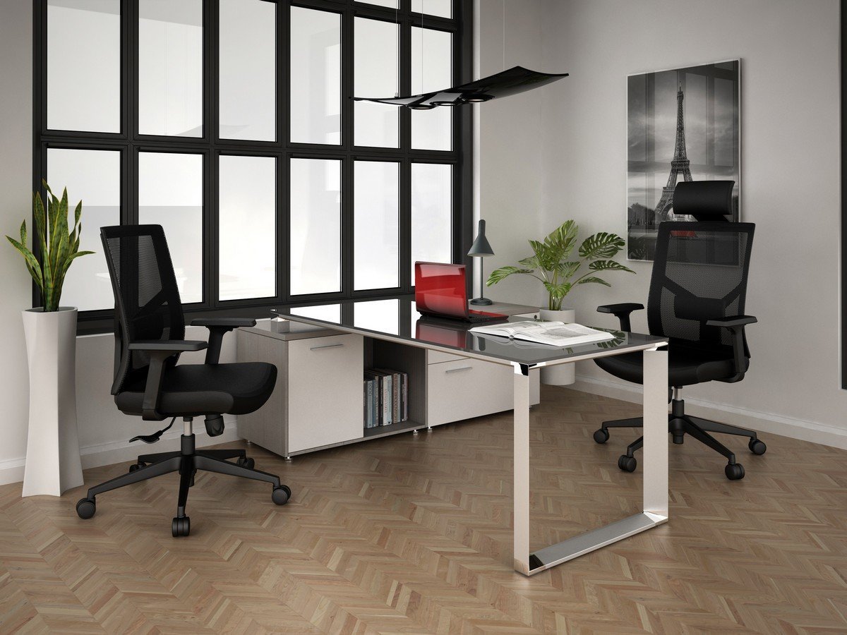 Escritorio ejecutivo frente con cubierta de vidrio, credenza baja lateral con 1 cajón papelero largo, 1 de archivo largo y 1 puerta corrediza con jaladeras rectas de aluminio, fabricado en melanina de primera calidad.