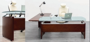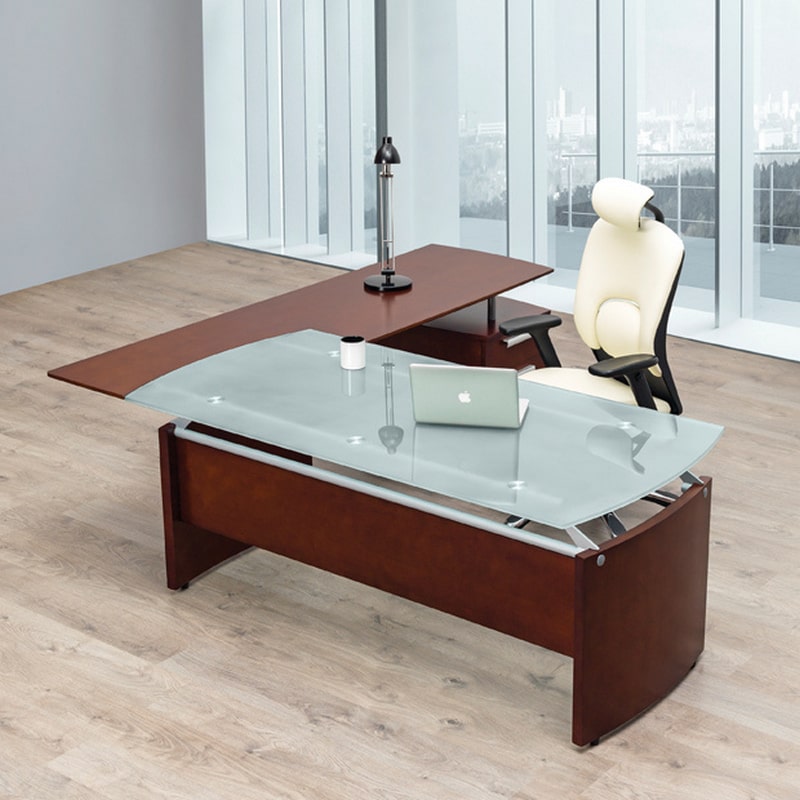ESCRITORIO EJECUTIVO ELEGANTE FABRICADO EN CHAPA DE MADERA DE ALTA CALIDAD Y CUBIERTA EN CRISTAL.