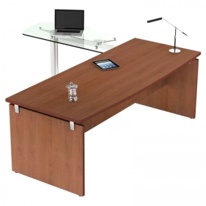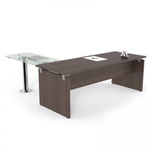 Este elegante escritorio es ideal para oficinas directivas y ejecutivas, ya que es una mezcla perfecta de estilo y funcionalidad. Cuenta con una extensión de cristal, lo que aligera el aspecto visual del mueble. Su construcción es fuerte y durable, óptimo para resistir el trabajo diario. Puede utilizarse con los sillones ejecutivos Kahlo y KB-0.