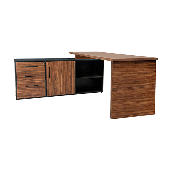 Escritorio semiejecutivo en “L”, cubierta en melamina de 28 mm. y canto rigido en PVC del mismo tono de la cubierta, pata en melamina de 28 mm, credenza lateral fabricada en melamina de 16 mm., con cajones (2 lapiceros y 1 archivo) con chapa de seguridad, puerta media con entrepaño al interior y entrepaño aun costado, regatones nivelador. regatones nivelador