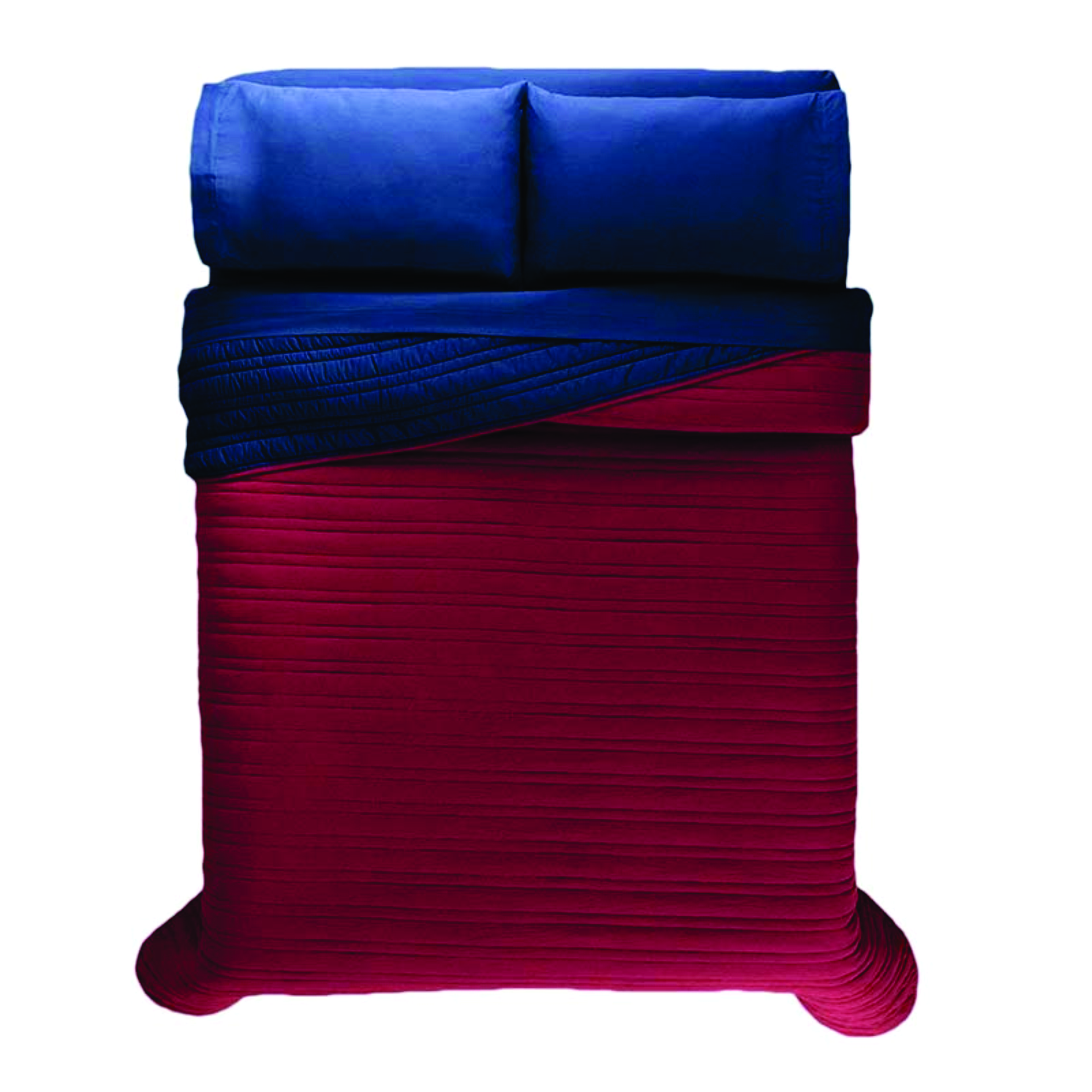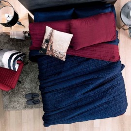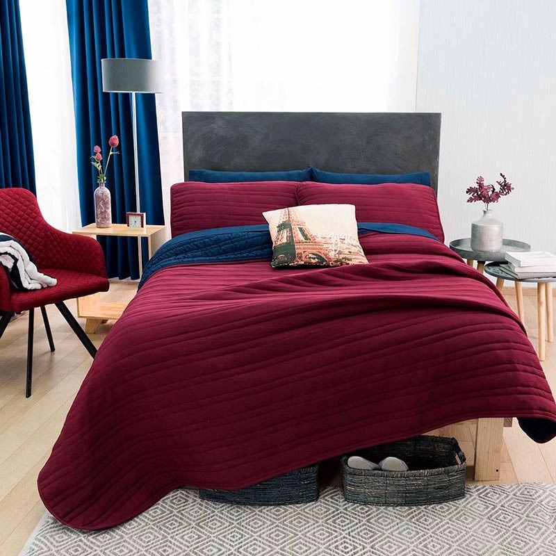 El tinto es un color sofisticado y muy favorecedor en combinación con el azul marino. Este diseño cuenta además con un capitonado que genera un efecto corrugado. Edredón de microfibra, textura viasoft súper suave y capitonado minimalista a rayas.