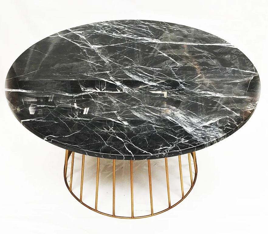 Dale un toque de lujo y sofisticación a tu sala con la mesa de centro redonda en mármol negro. Su cubierta elegante y resistente se combina con una base metálica en color dorado, creando un contraste moderno y refinado que realza cualquier decoración. Una pieza única que mezcla funcionalidad y diseño exclusivo.