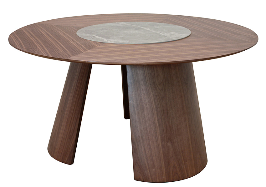 La cubierta ofrece una apariencia elegante tipo mármol con la calidez natural del nogal, mientras que su pedestal en madera sólida Rubber garantiza estabilidad, durabilidad y soporte firme.