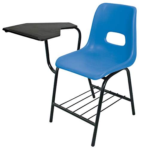estructura: de acero tubular de 7/8" de diámetro, calibre 18, parrilla en perfil pulido redondo de acero de 3/16" de diámetro; con acabado de pintura epóxica (electrostática) color negro mate. asiento y respaldo: de una sola pieza en polipropileno de alta resistencia y duración. paleta: color negro, azul, rojo, gris en copolimero de polipropileno de alta densidad, en 1/2" de espesor con embutido para lápiz. color: amarillo, rojo, verde, azul eléctrico, naranja, negro. peso máximo de resistencia: 100 kgs. NOTA: disponible con paleta lateral lado izquierdo (fabricación sobre pedido). La paleta en color rojo, azúl o gris es sobre pedido y un mínimo de 300 pzs.