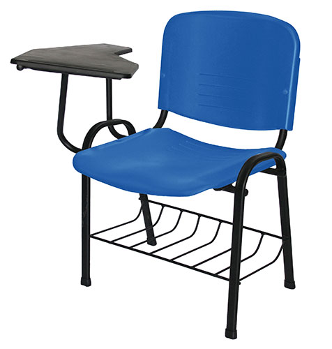 estructura: de acero tubular ovalado de 1 1/4" X 19/32", calibre 18; con acabado de pintura epóxica (electrostática) color negro mate. parrilla: en perfíl pulido redondo de acero en 3/16" de diámetro. asiento y respaldo: en dos piezas en polipropileno de alta resistencia y duración. color: negro. paleta: color negro, azúl, rojo, gris en copolimero de polipropileno de alta densidad, en 1/2" de espesor con embutido para lápiz. peso máximo de resistencia: 120 kgs. NOTA: disponible con paleta lateral lado izquierdo (fabricación sobre pedido). La paleta en color rojo, azúl o gris es sobre pedido y un mínimo de 300 pzs.