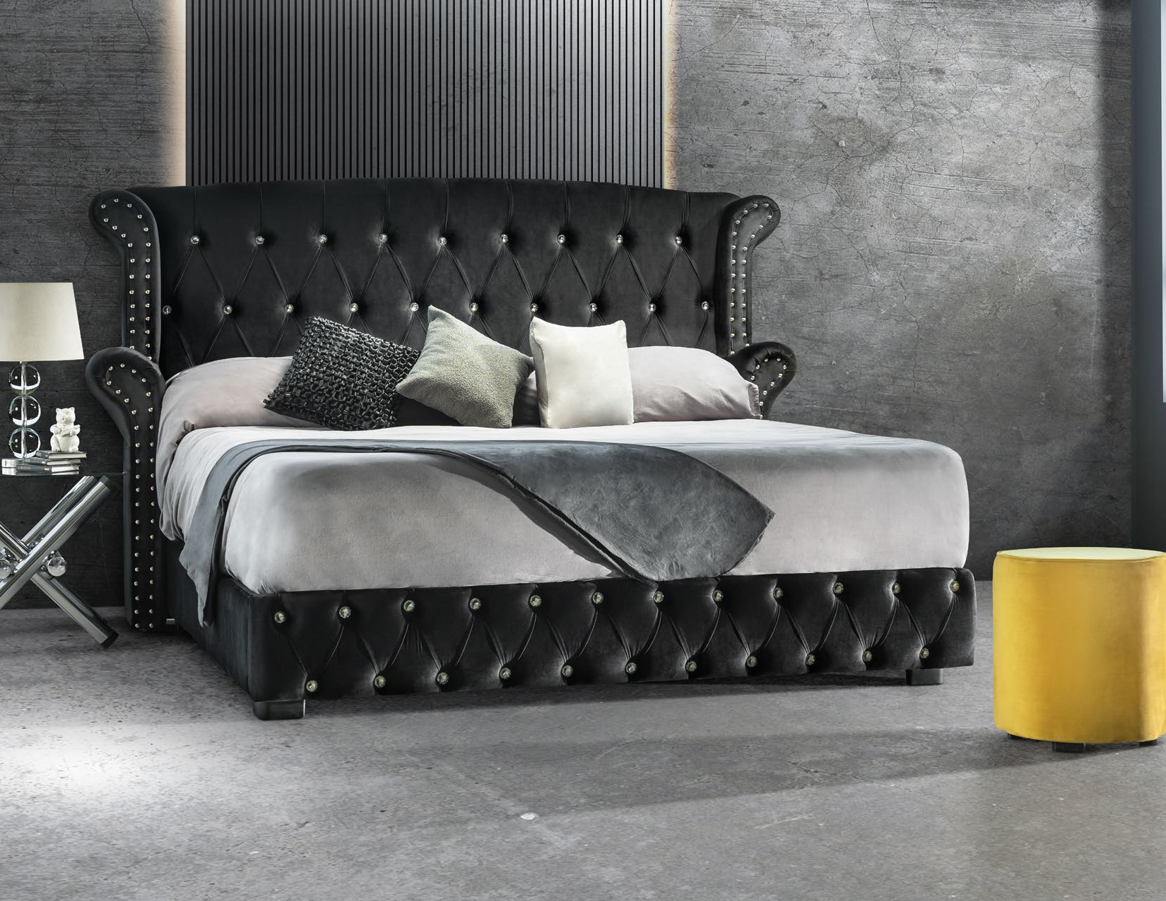 Moderna recamara capitonada, disponible en color negro.