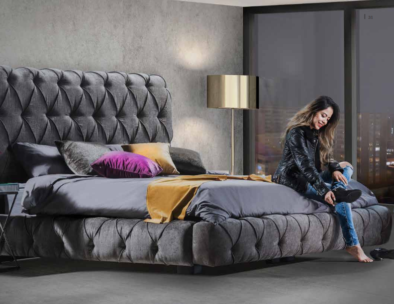 Diseño vibrante en la cabecera con una altura de 1,45 m, frente y laterales con tapizado en tela infinity, perfecta para espacios elegantes en color gris.