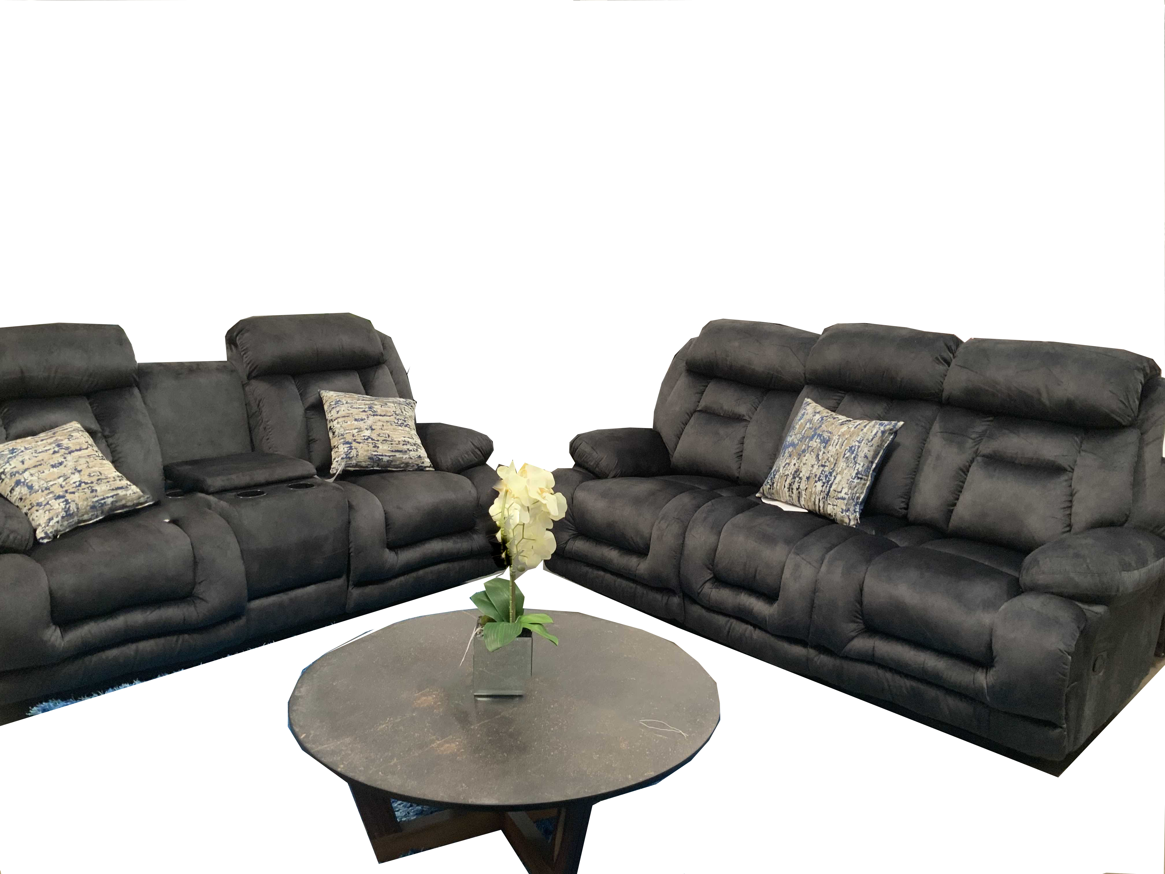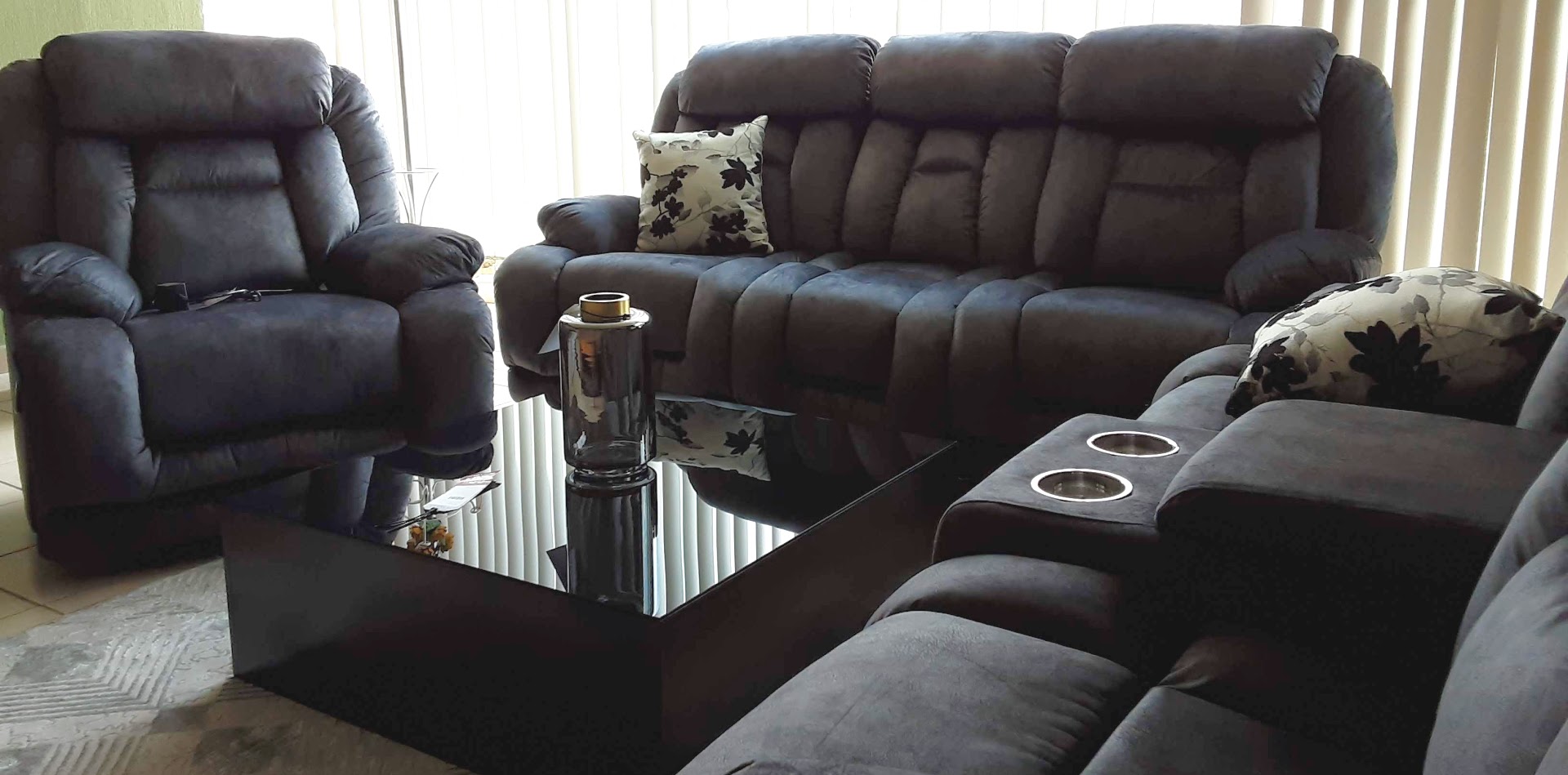 Sala de 3 piezas, cuenta con cinco sillones reclinables y portavasos