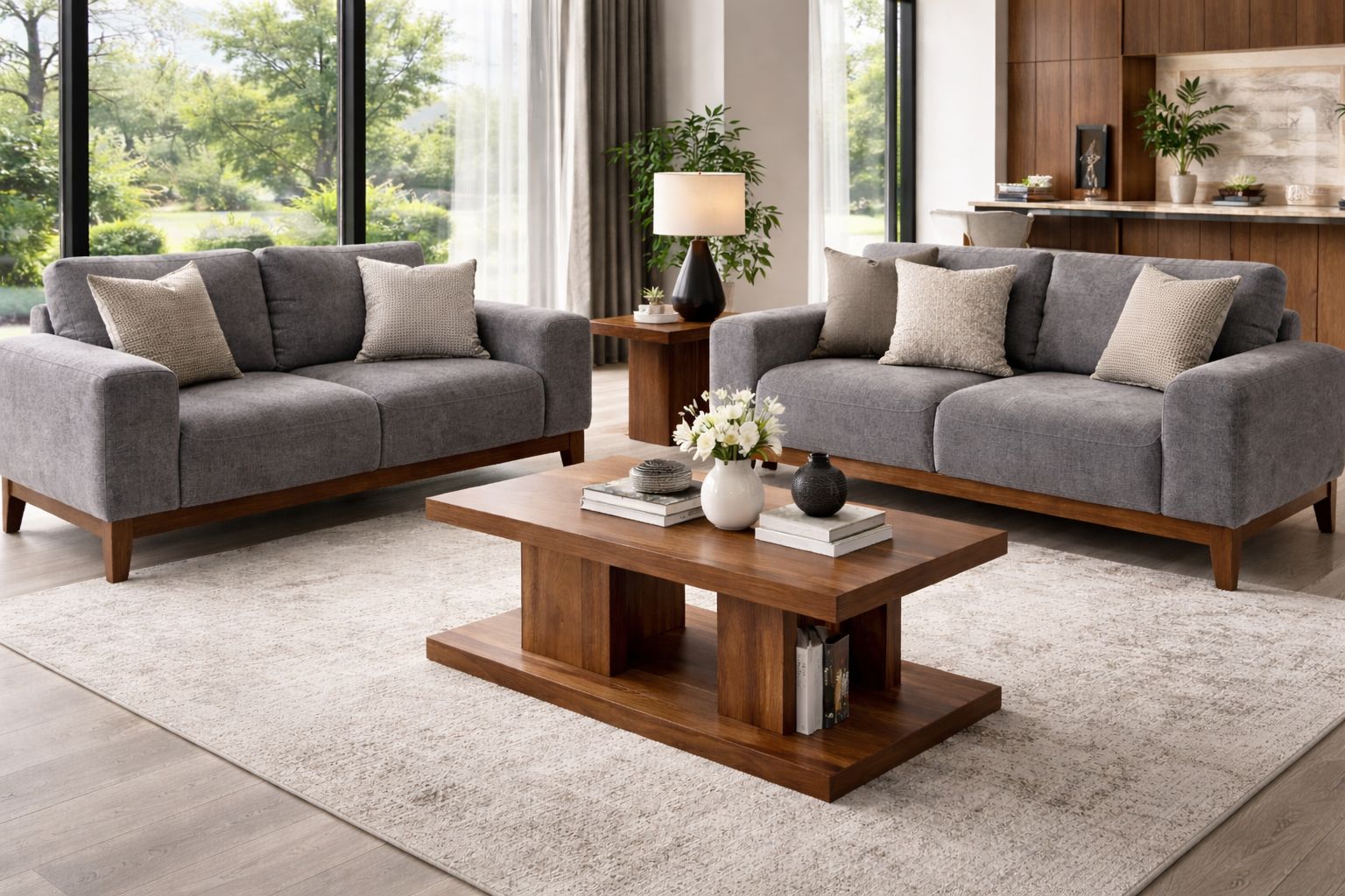 Eleva tu espacio con esta elegante sala 3-2 de diseño moderno, perfecta para hogares que buscan estilo, confort y sofisticación. Su tapizado en tono gris neutro y su estructura con base de madera natural crean una combinación atemporal que se adapta a las tendencias de interiorismo 2026.