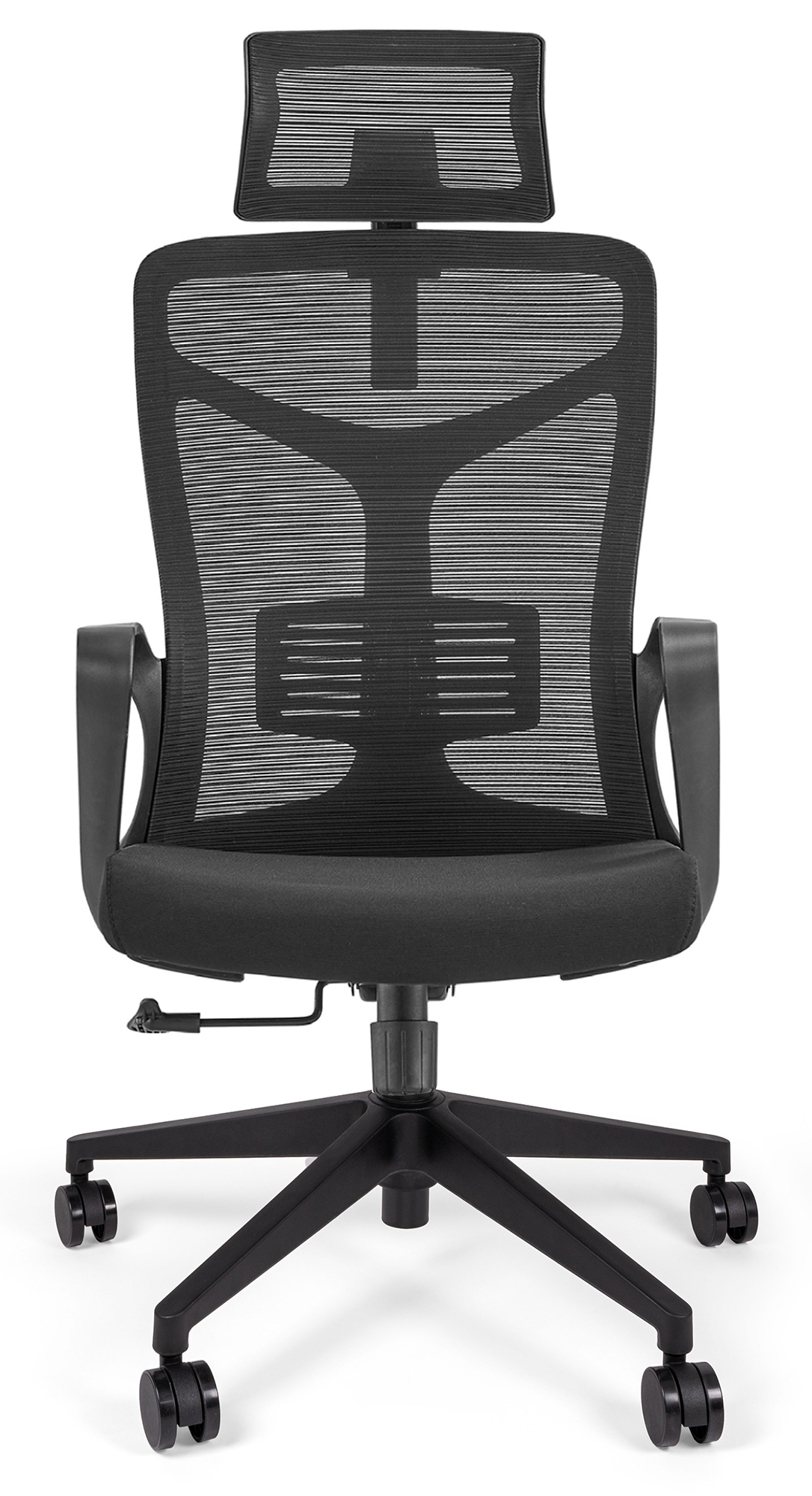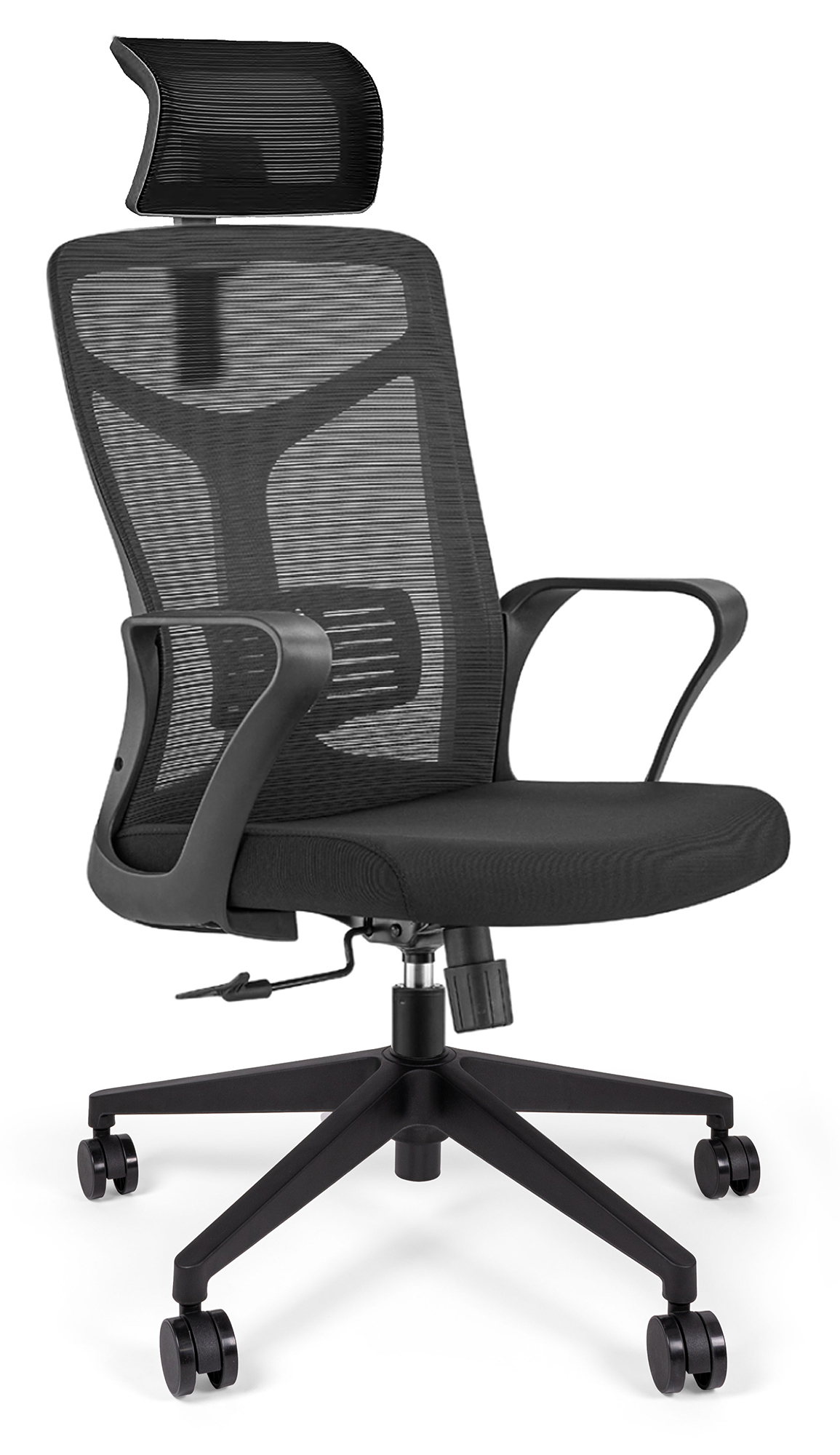 Base:estrella de 5 puntas en poliamida, rodajas tipo dual. elevación: por medio de pistón neumático que permite ajustar la altura del asiento. mecanismo: plato de acero reforzado con sistema de reclinación y palanca de bloqueo, perilla de regulación de tensión para el sistema de reclinación. cabecera: ajustable. respaldo: en malla de diseño ergonómico con soporte lumbar ajustable y cabecera. asiento: hule espuma laminado flexible con alta densidad de 30 kgs/m3 con retardante a la flama y alta resilencia. tapiz: respaldo de malla de color negro y asiento tapizado en funda de tela de color negro con pespunte. peso máximo de resistencia: 120 kgs.