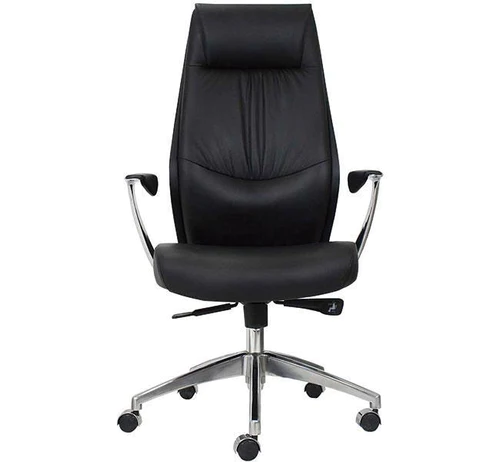 Silla de dirección con respaldo alto, acojinamiento en asiento de poliuretano inyectado, descansabrazos fijo de aluminio pulido y base de 5 puntas de aluminio pulido.
