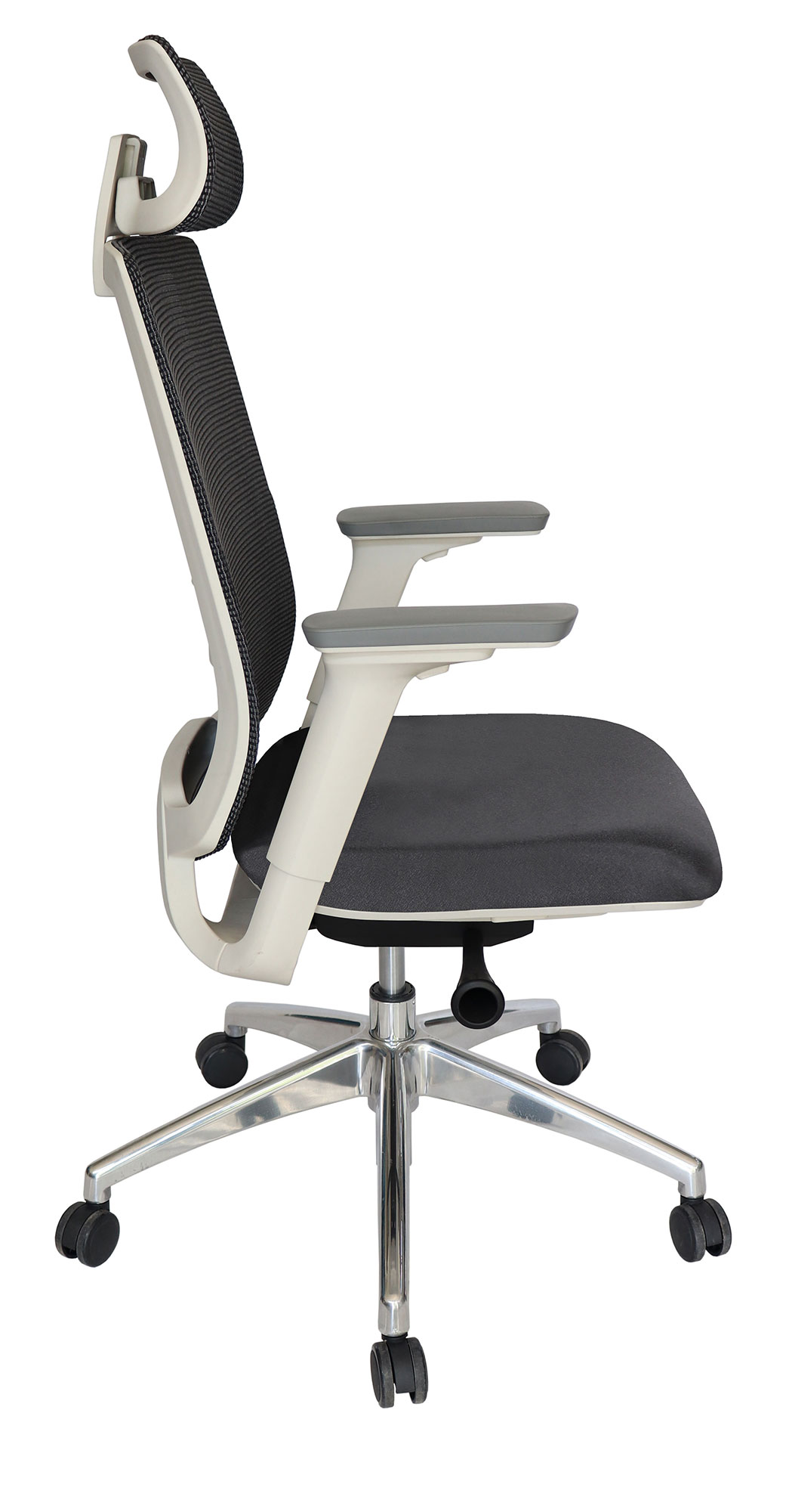 base: estrella de 5 puntas en lámina de acero color gris, rodajas tipo dual y/o regatones. elevación: por medio de pistón neumático que permite ajustar la altura del asiento. mecanismo: de acero reforzado tipo articulado synchro con anti-shock y slider, con palanca de bloqueo del pistón neumático, con palanca de bloqueo de el ángulo del respaldo y otra palanca para el accionamiento del slide en sus diferentes posiciones. brazos: tipo 4D giratorios y ajustables de altura en poliuretano semi-rígido y suave. respaldo: en malla de diseño ergonómico con cabecera. asiento: hule espuma de poliuretano inyectado flexible con densidad de 60 kgs/m³ con retardante a la flama y alta resilencia. tapiz: respaldo de malla de color gris y asiento en tela o vinil al color de su elección de nuestro catálogo. peso máximo de resistencia: 120 kgs.