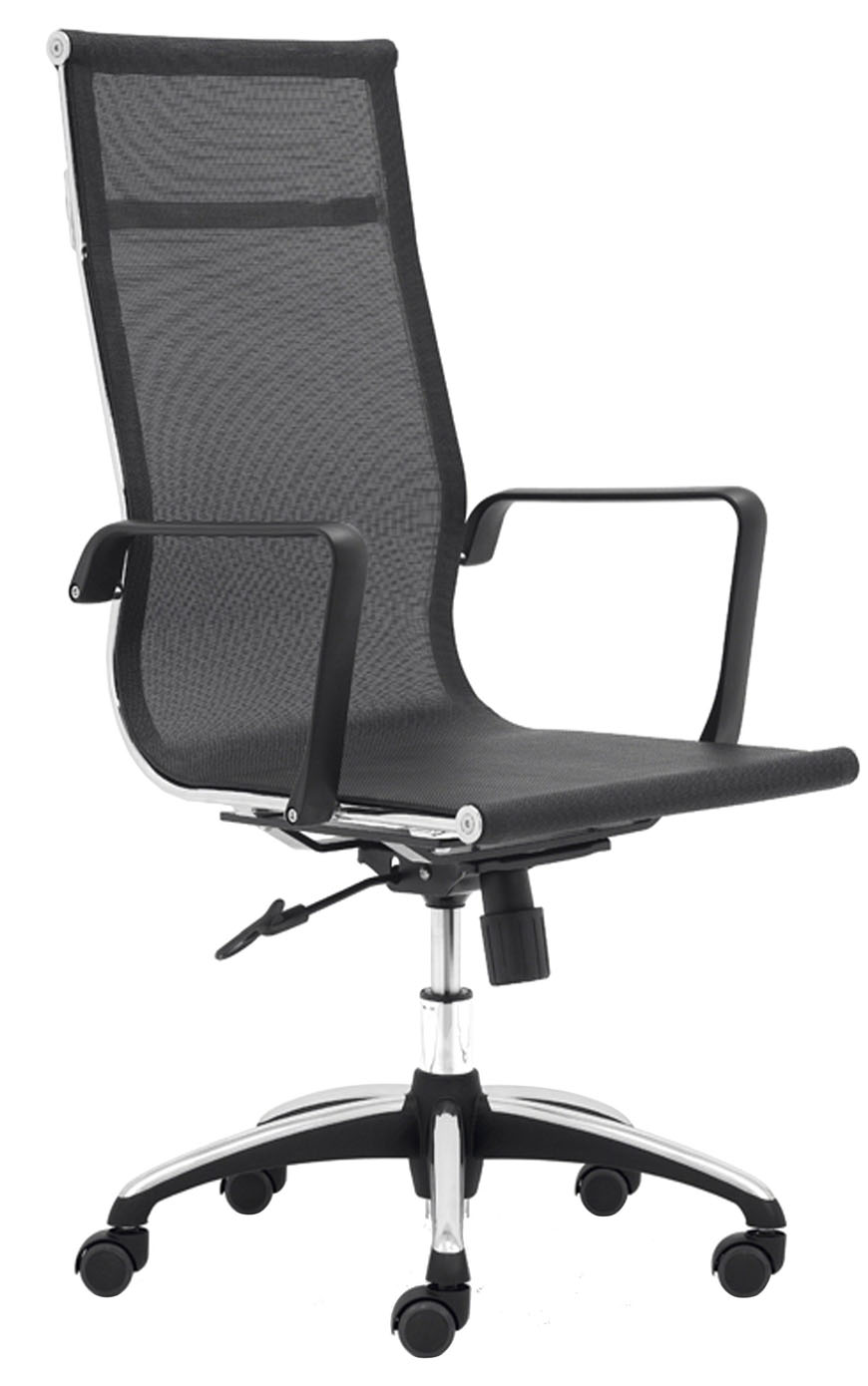 base: estrella de 5 puntas en nylon reforzado con cubierta de lámina de acero terminada en cromo y con rodajas tipo dual y/o regatones. elevación: por medio de pistón neumático que permite ajustar la altura del asiento. mecanismo: plato de acero reforzado con sistema de reclinación y palanca de bloqueo, perilla de regulación de tensión para el sistema de reclinación. brazos: de polipropileno semi-rígido color negro. asiento y respaldo: de respaldo alto con bastidor redondo tubular de 1" de diámetro, calibre 16. tapiz: en malla de color negro. peso máximo de resistencia: 160 kgs.