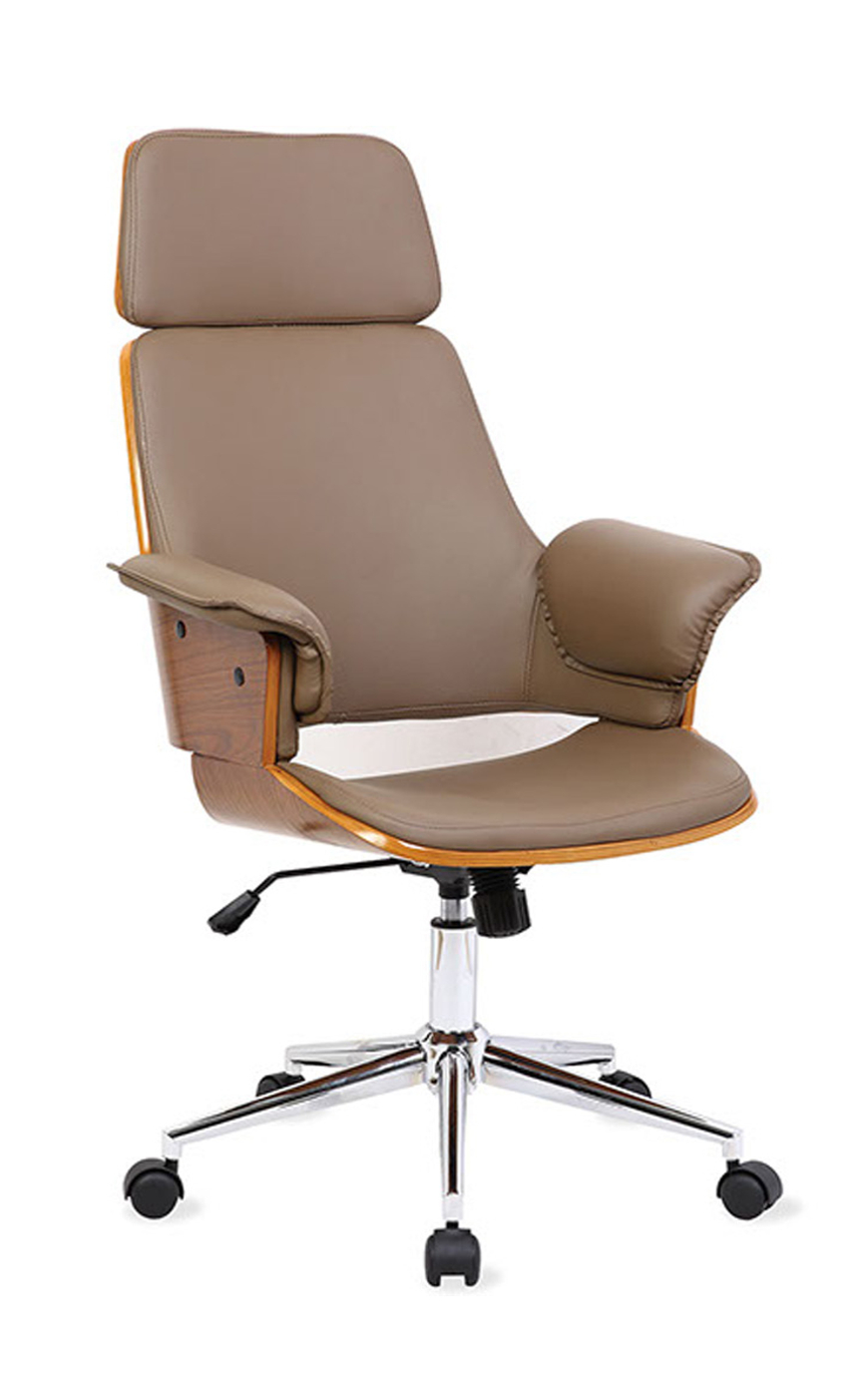 Silla para escritorio de madera termoformada, tapiz en imitación piel, base hidráulica con ruedas en metal cromado.