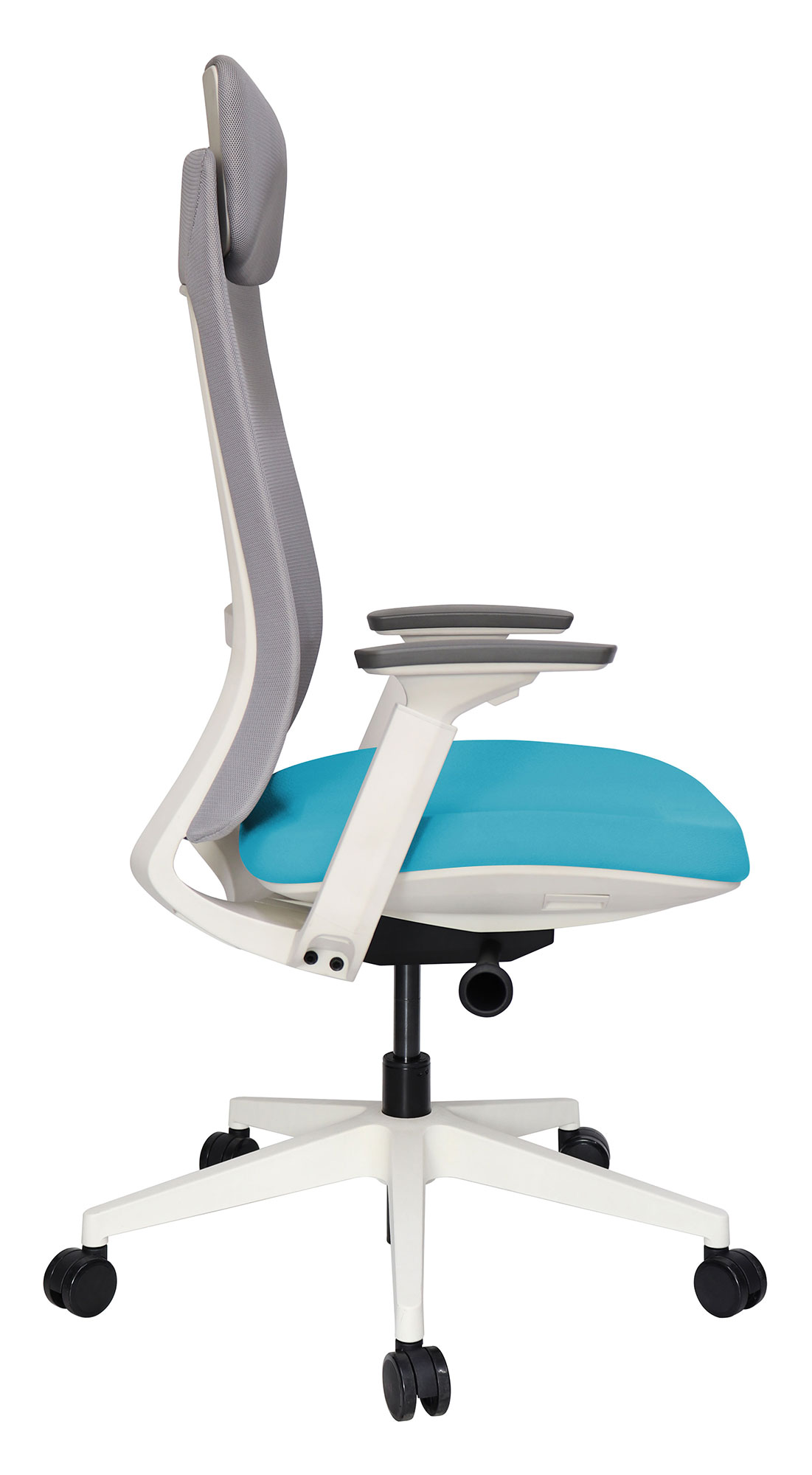 base: estrella de 5 puntas en nylon reforzado, rodajas tipo dual y/o regatones. elevación: por medio de pistón neumático que permite ajustar la altura del asiento. mecanismo: de acero reforzado tipo articulado synchro con anti-shock y slider con palanca de bloqueo del pistón neumático, con palanca de bloqueo de el ángulo del respaldo y botón para el accionamiento del slider en sus diferentes posiciones. brazos: tipo 3D giratorios y ajustables de altura en poliuretano semi-rígido y suave. respaldo: en malla de diseño ergonómico con cabecera. asiento: hule espuma de poliuretano inyectado flexible con densidad de 60 kgs/m³ con retardante a la flama y alta resilencia. tapiz: respaldo de malla de color gris y asiento en tela o vinil al color de su elección de nuestro catálogo. peso máximo de resistencia: 130 kgs.
