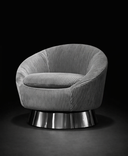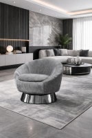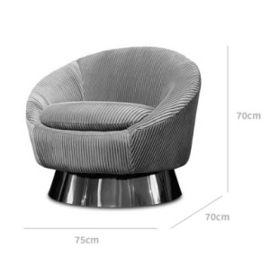 Está tapizado en tela suave de alta calidad, que brinda una apariencia moderna y fácil de integrar en distintos estilos de interiorismo. Su base metálica con acabado brillante aporta estabilidad, durabilidad y un toque sofisticado que eleva el diseño del sillón.