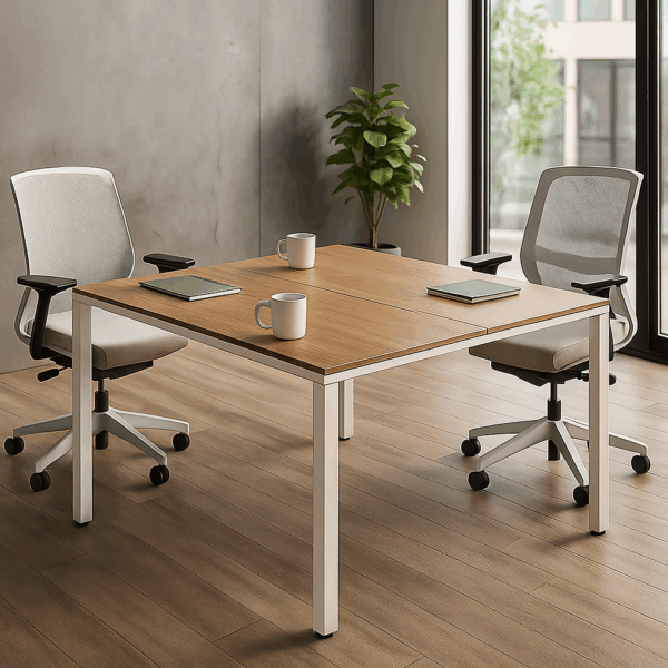 Billydesk es un sistema modular de oficina flexible y funcional. Cubiertas de melamina 16 mm con cantos PVC, estructura y patas metálicas con pintura electrostática, niveladores y ensamble fácil. Resistente, durable y para 2-4 usuarios.