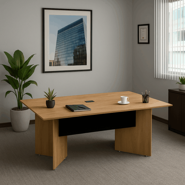 Mesa Línea M para sala de juntas, moderna y resistente. Melamina de 16 mm con cantos PVC, base estable, gromete central y niveladores. Ensamble minifix sin herramientas. Capacidad para 6-8 personas y hasta 200 kg. Ideal para reuniones y colaboración profesional.
