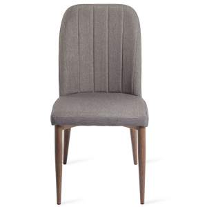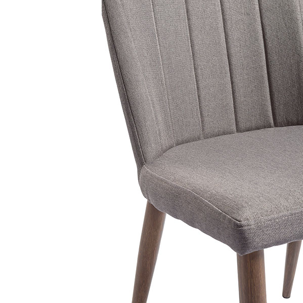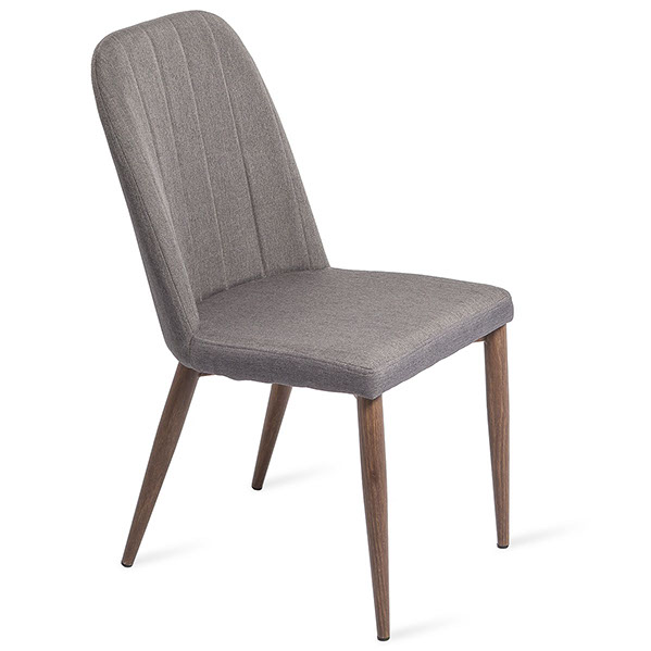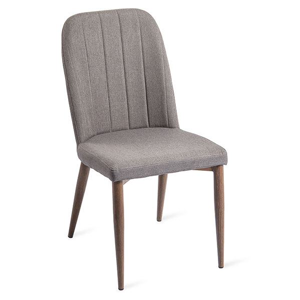 Silla tapizada en tela tipo lino con base de metal apariencia madera color nogal.