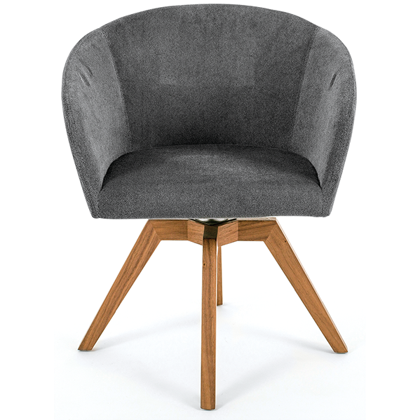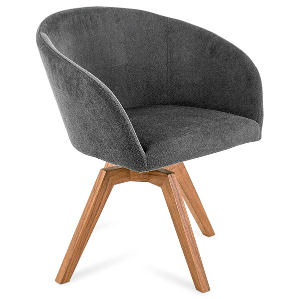 Silla tapizada en tela tipo terciopelo con base giratoria de madera.