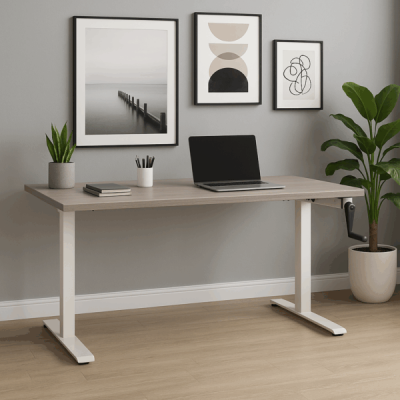 MESADETRABAJOALTURAAJUSTABLEMANUAL120*60Mesa ajustable en altura manual o eléctrica para trabajo ergonómico. Cubierta de melamina 16 mm y estructura metálica blanca con